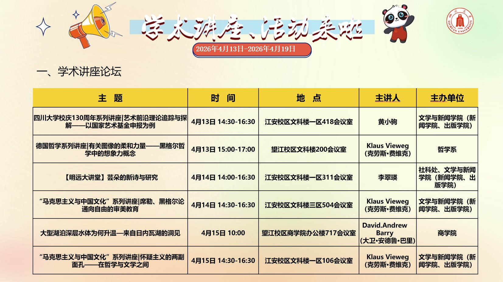 成人直播 2026年4月13日-2026年4月19日学术讲座预告