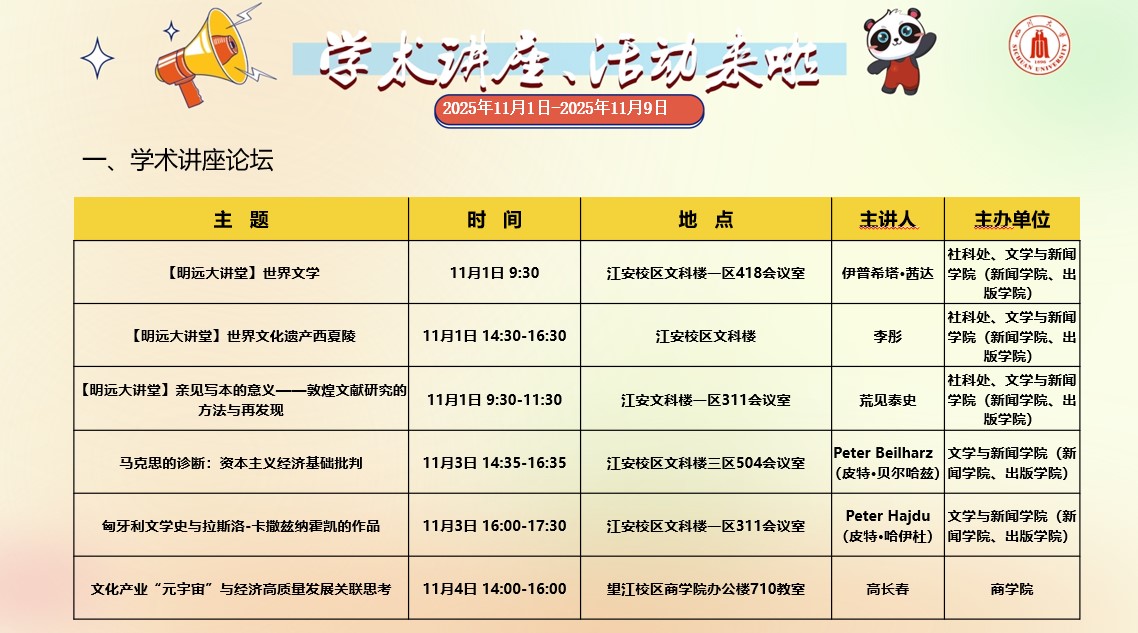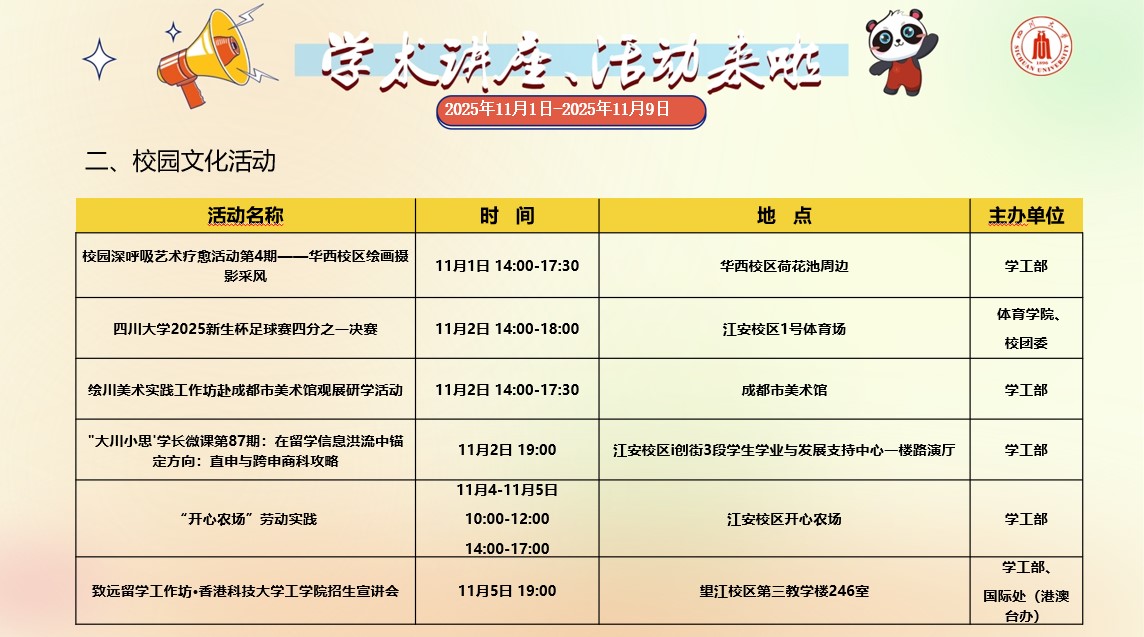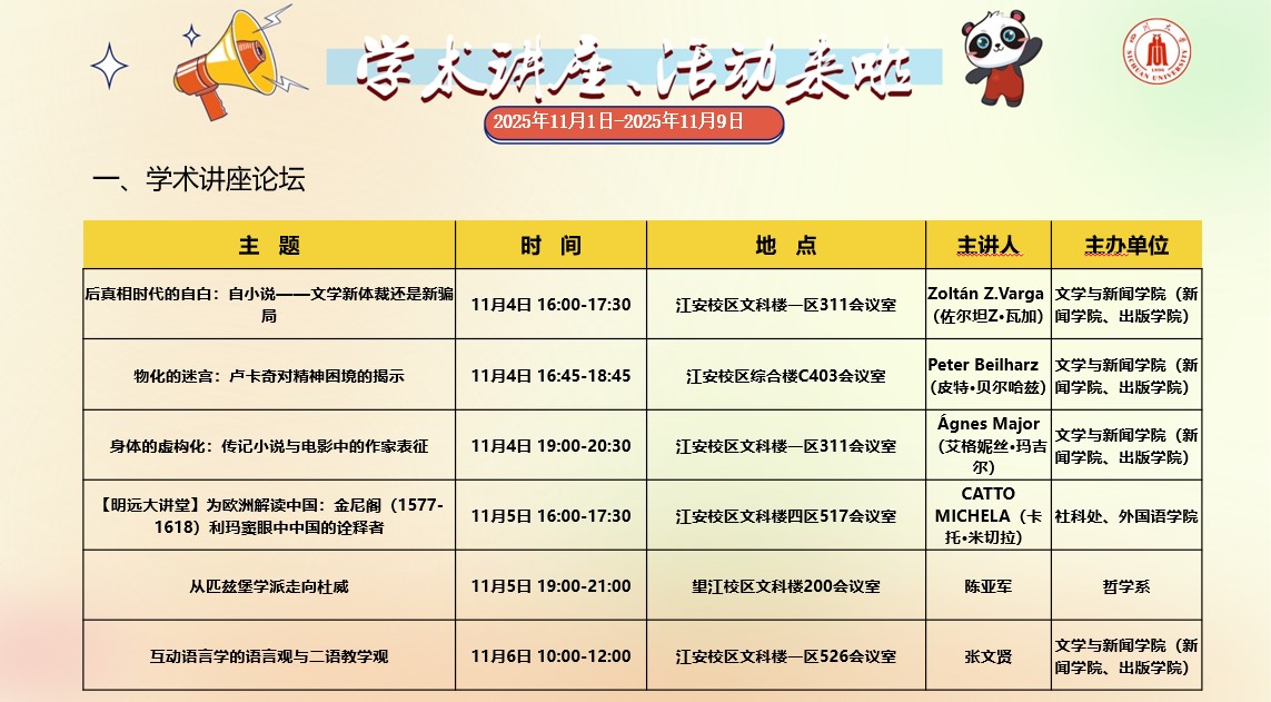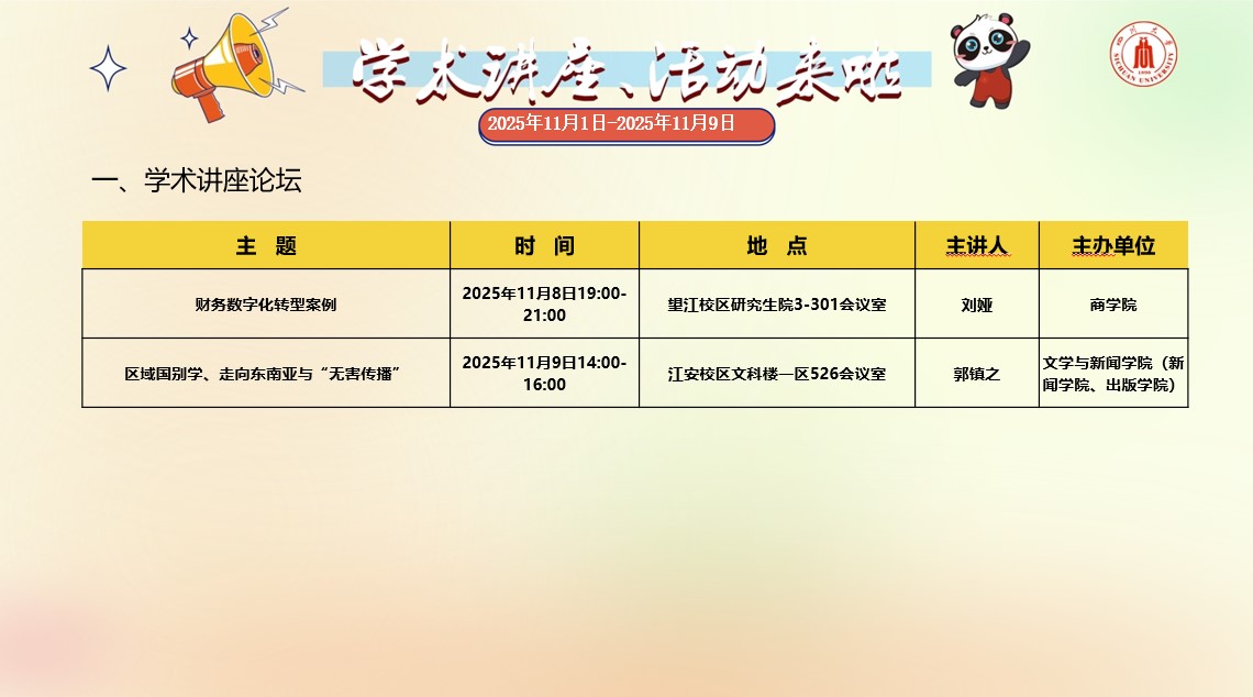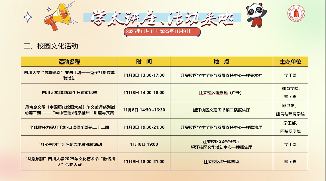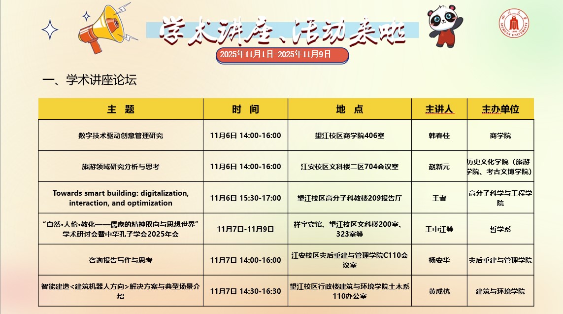 成人直播 2025年11月1日-11月9日学术讲座和校园文化活动预告