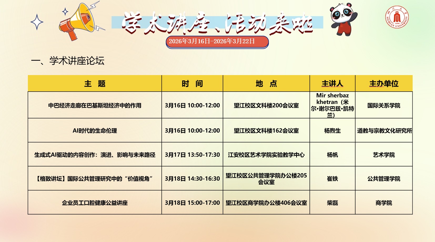 成人直播 2026年3月16日-2026年3月22学术讲座预告