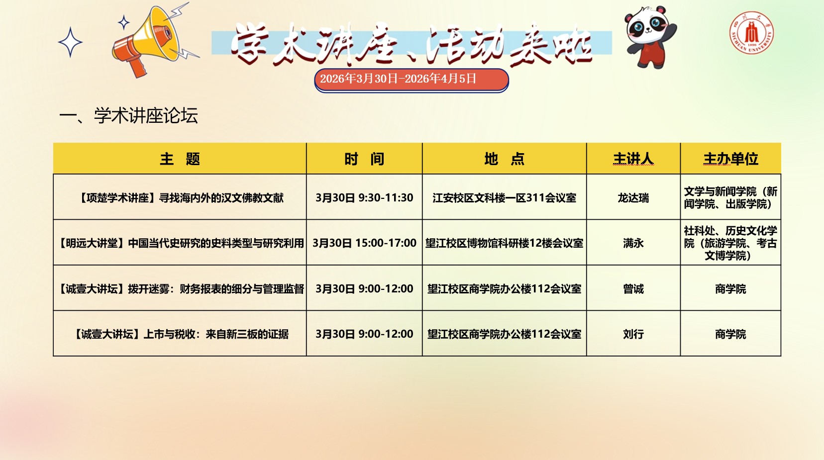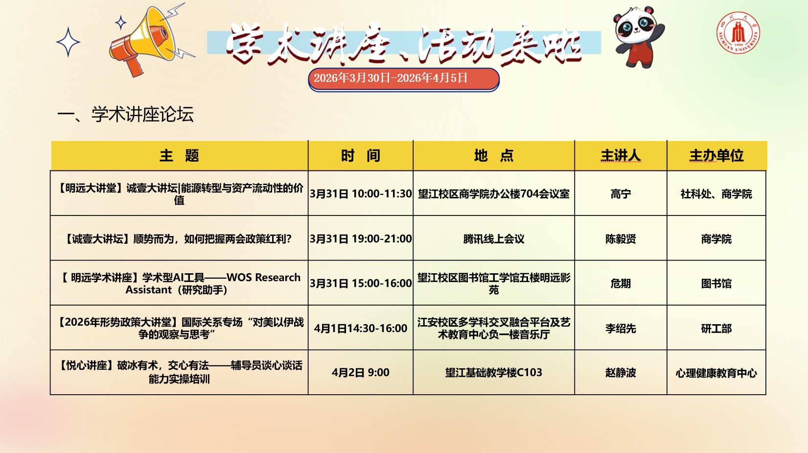 成人直播 2026年3月30日-2026年4月5日学术讲座预告