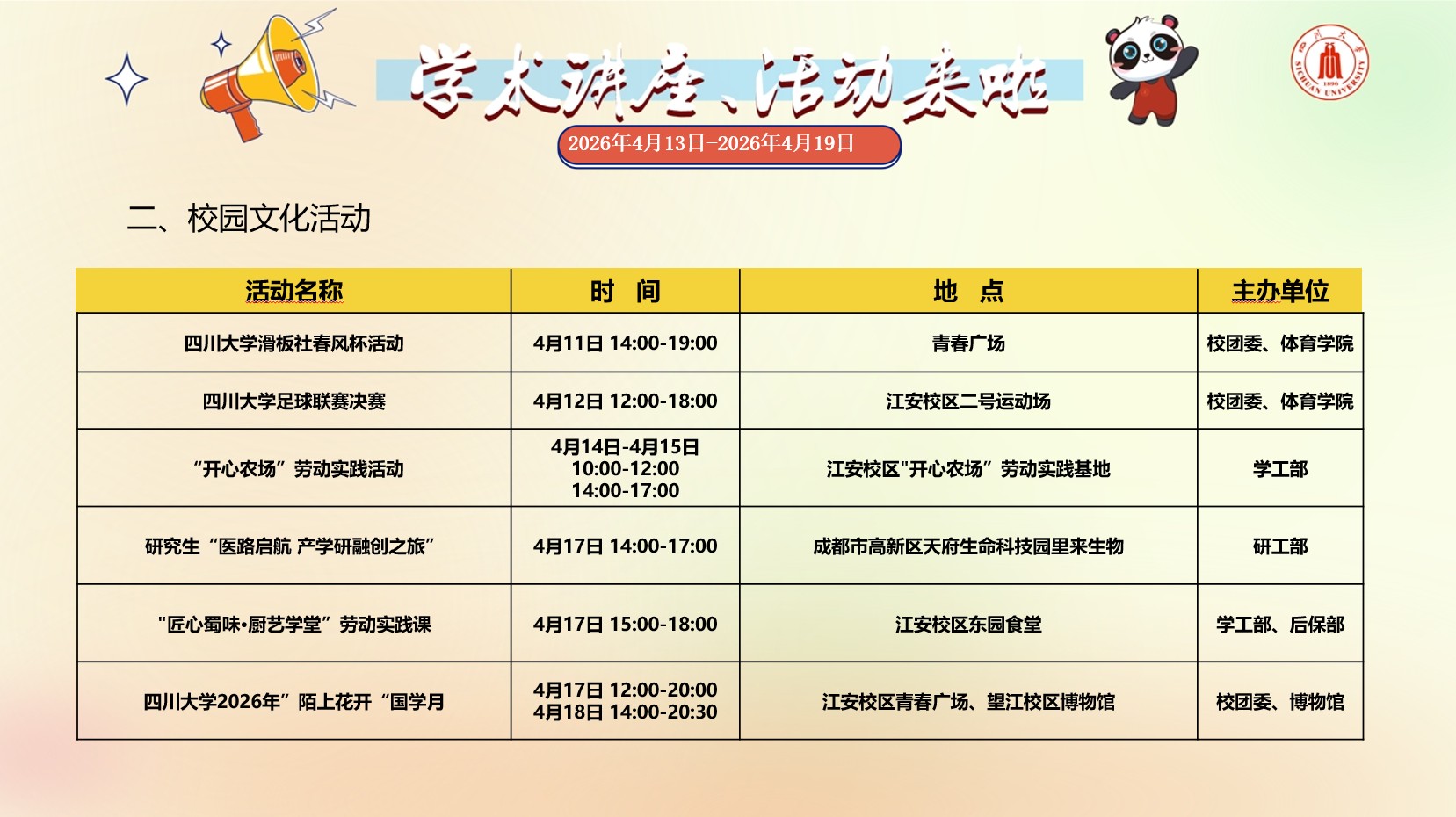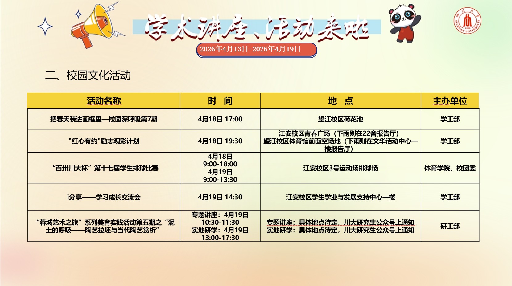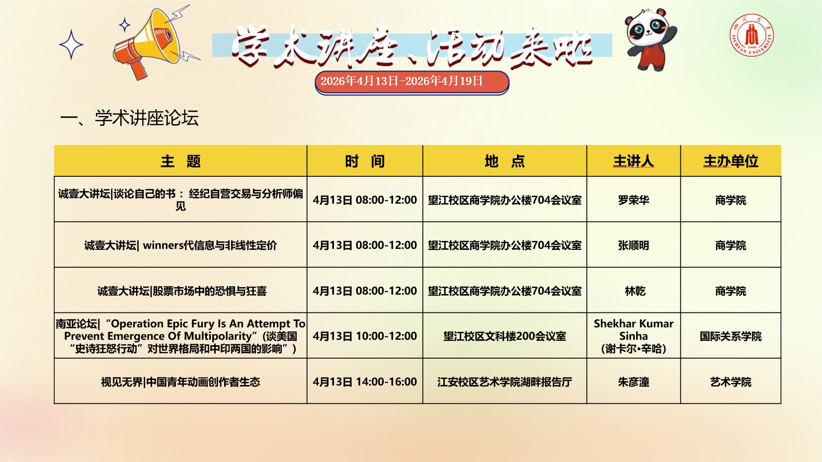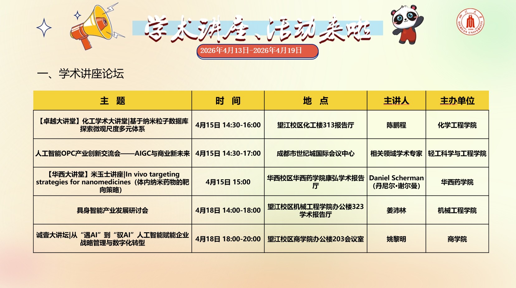 成人直播 2026年4月13日-2026年4月19日学术讲座预告