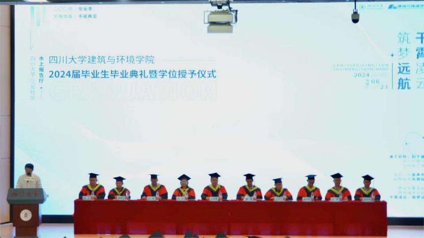 6�21日,学院2024届毕业生毕业典礼暨学位授予仪式在江安校区水上报告厅举行。学院党委书记华国春,院长戴峰,学术院长、教授委员会主任熊峰,副院长兰中仁、刘敏,工会主席楚英豪,土木工程系系主任戴靠山,建筑系系主任赵炜,环境科学与工程系主任赖波,力学科学与工程系系主任刘永杰,毕业班辅导员高倩、赵梓丞、王婷婷、刘凡、蒋卓婷、杨鸿出席典礼。典礼由学院党委副书记兼纪委书记孙伯雷主持�