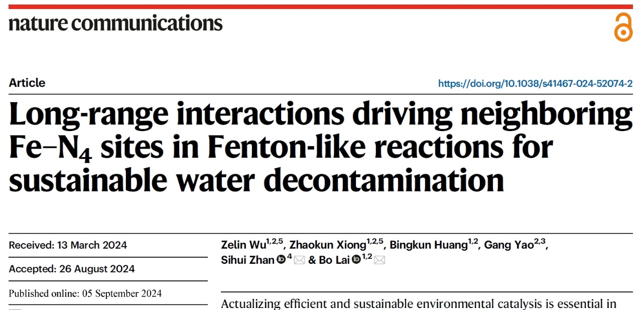 近日,成人直播环境系赖波/熊兆锟团队在Nature Communications在线发表了题为“Long-range interactions driving neighboring Fe–N4 sites in Fenton-like reactions for sustainable water decontamination”的研究论文。成人直播博士研究生吴泽林、熊兆锟副研究员为论文共同第一作者,成人直播赖波教授和南开大学展思辉教授为论文共同通讯作者。成人直播