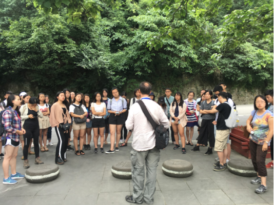 (艾丹教授在都江堰景区前为大家做都江堰水利工程的介绍)